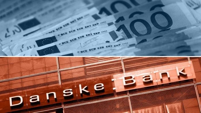 Visual representation of the Danske Bank money laundering scandal, combining currency notes and the bank signage.